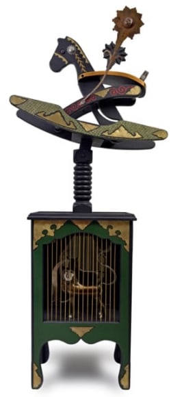 Wood, brass, mirror, nails, LED light
